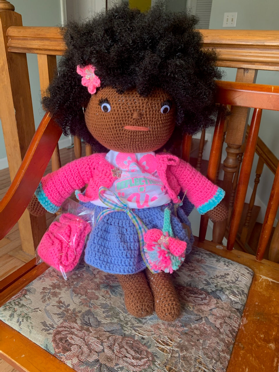 Enchanting mocha toned handmade crochet doll with customized ROU t-shirt; hand crochet tulle skirt; adorable cropped sweater with matching legwarmers and accessories.