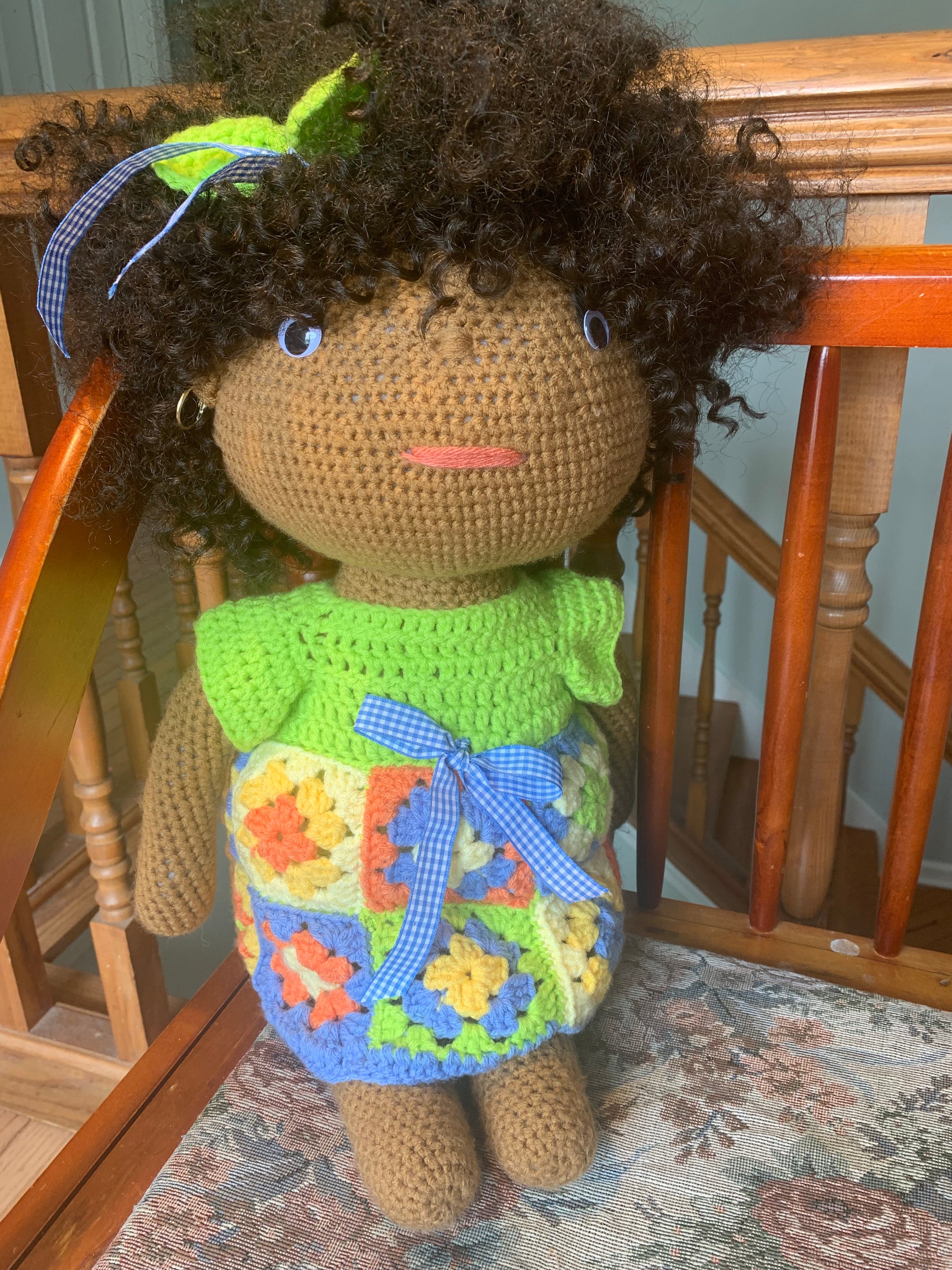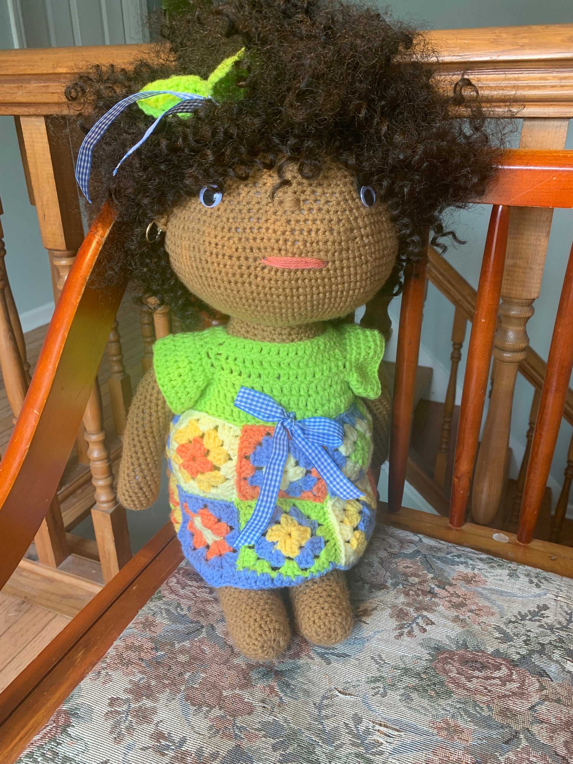 Precious caramel toned handmade crochet doll with a customized crochet granny square multicolored peasant dress; handmade matching bloomers; and additional crochet bows and accessories.